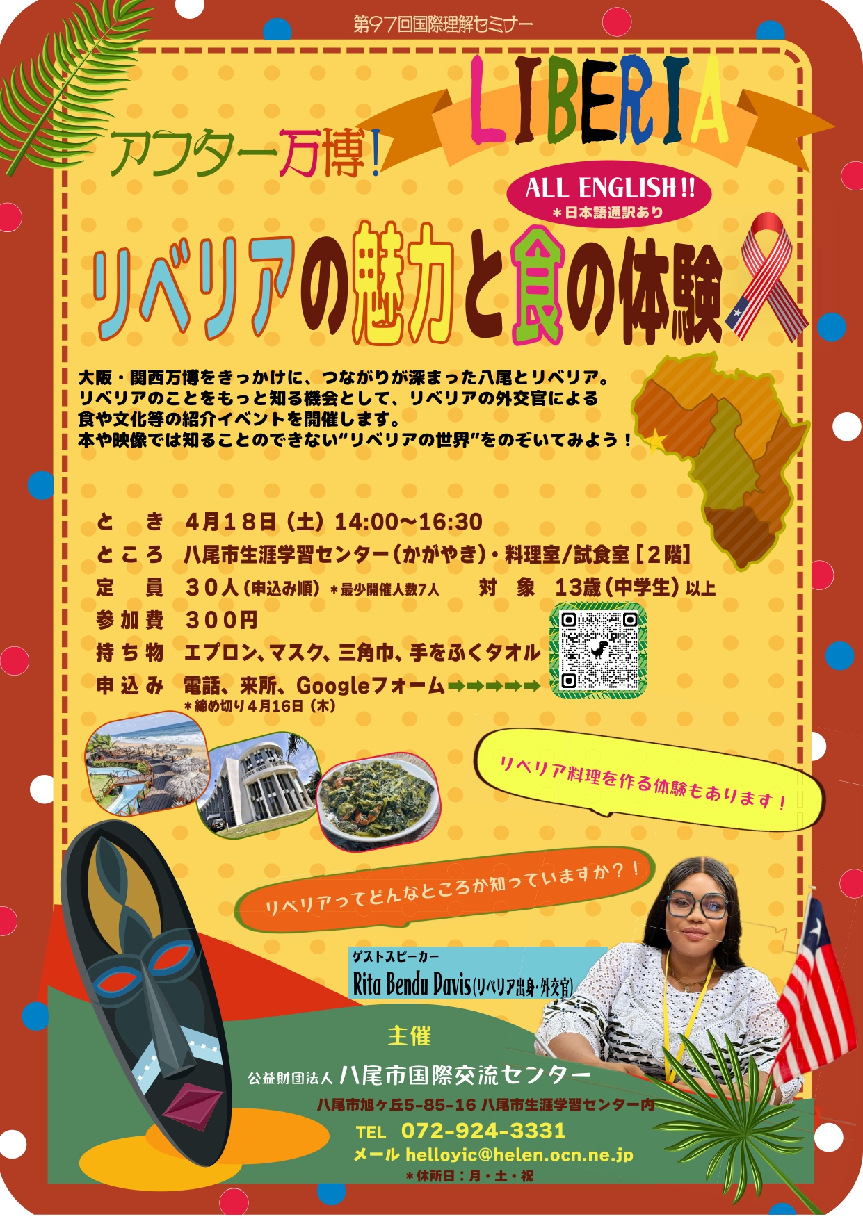 | 内容 | 大阪・関西万博をきっかけに、つながりが深まった八尾とリベリア。 アフター万博イベントとして、リベリアの外交官による食や文化等の紹介をします! 本や映像では知ることのできない”リベリアの世界”をのぞいてみよう! *リベリア料理作り体験あり! *使用言語:英語(日本語通訳つき)