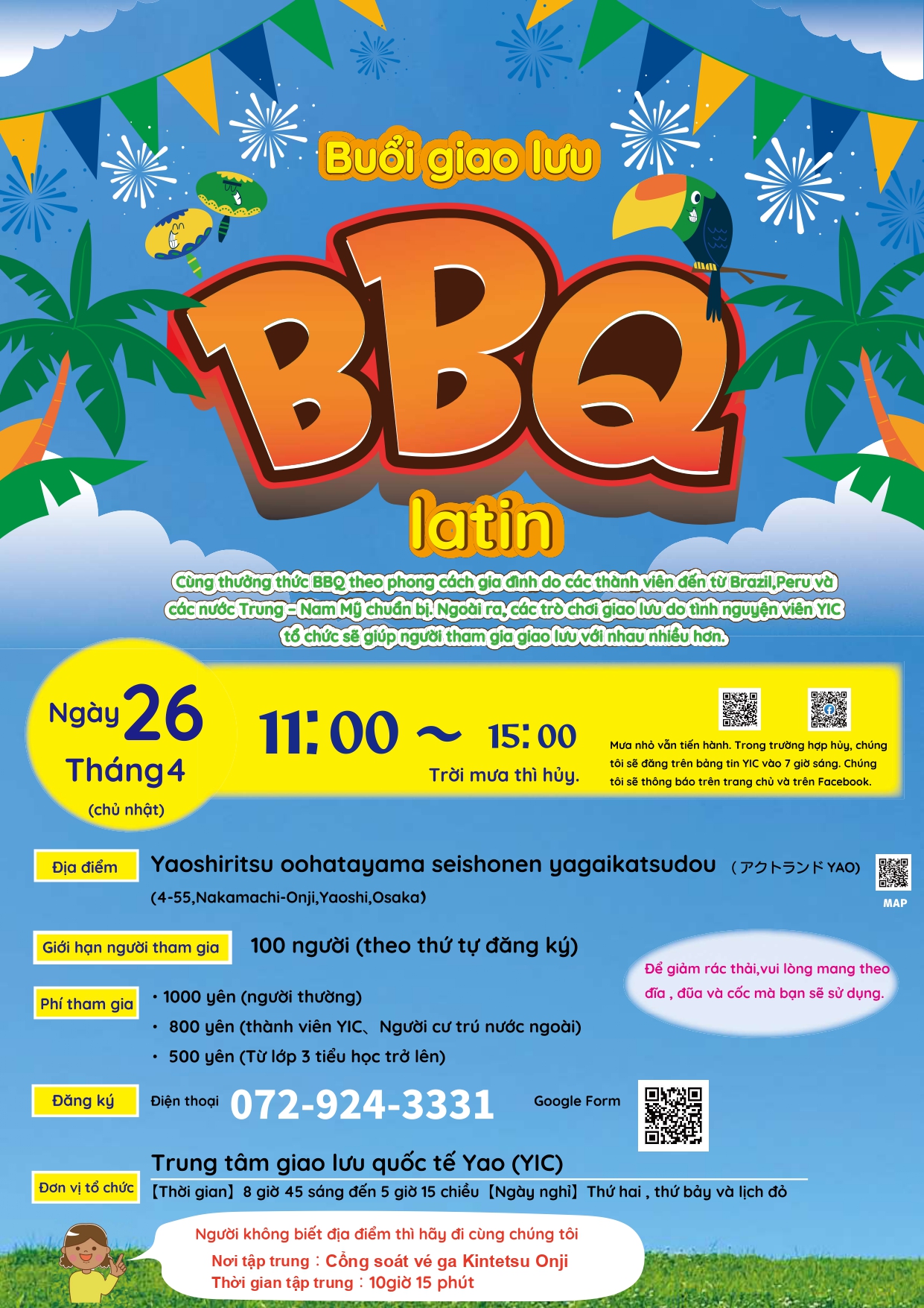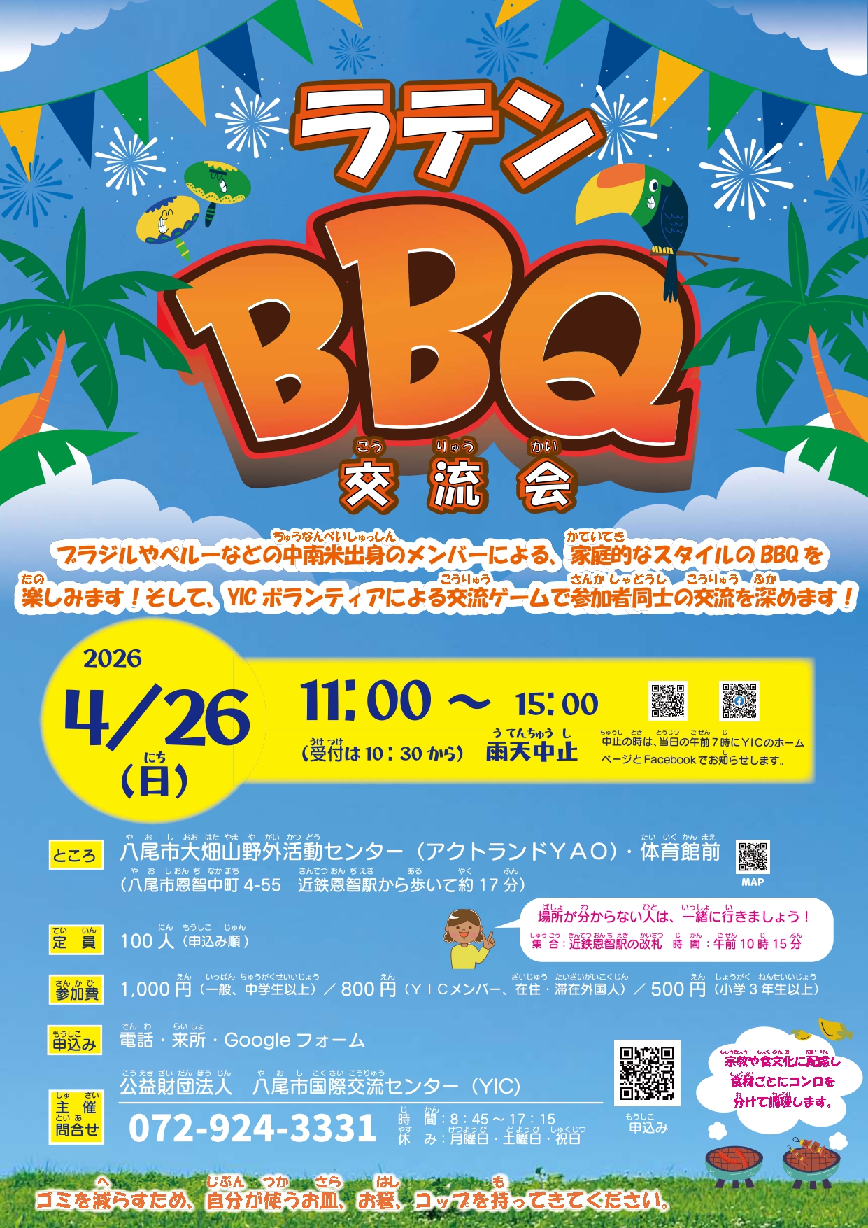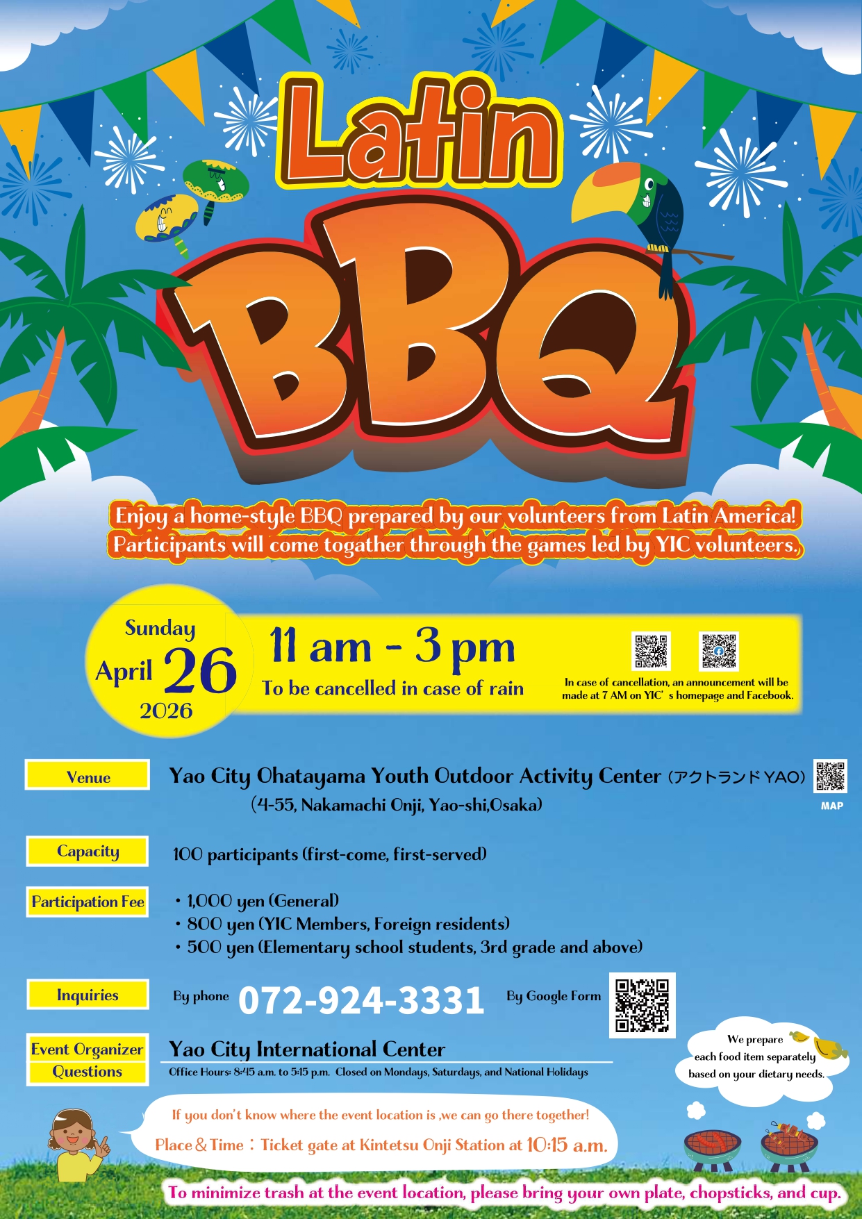 | 内容 | ブラジルやペルーなど、中南米の文化を感じられる、明るく楽しいラテンスタイルのBBQ交流会です。 青空の下で、ゲームやおしゃべりを楽しみ、友だちの輪を広げましょう! ゴミを減らすため、自分が使うお皿、お箸、コップを持ってきてください! *小雨決行。中止のときは、当日の午前7時に当交流センターのホームページとFacebookでお知らせします。 |