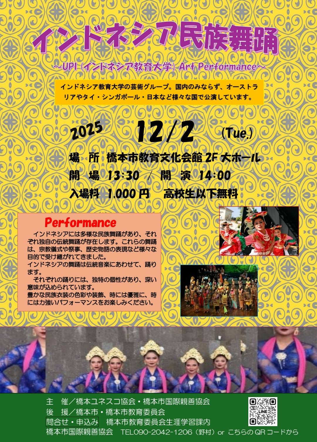 | 内容 | インドネシア教育大学(UPI)の民族舞踊団が、和歌山県の橋本市で公演を行います! 伝統音楽に合わせた優雅で力強い舞踊をお楽しみいただけます。 インドネシアの芸術に触れる絶好のチャンス!インドネシアの魅力をぜひ間近で体感してみませんか? |