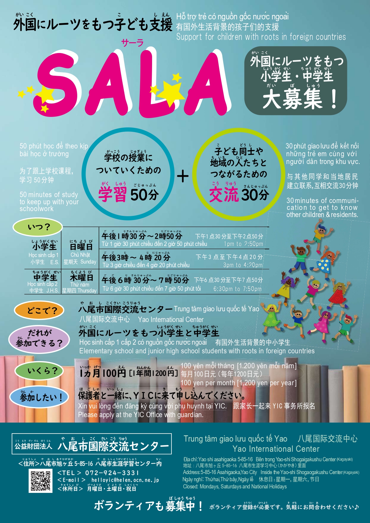 八尾市国際交流センター(YIC) 八尾市旭ヶ丘5-85-16 八尾市生涯学習センター内 TEL:072-924-3337